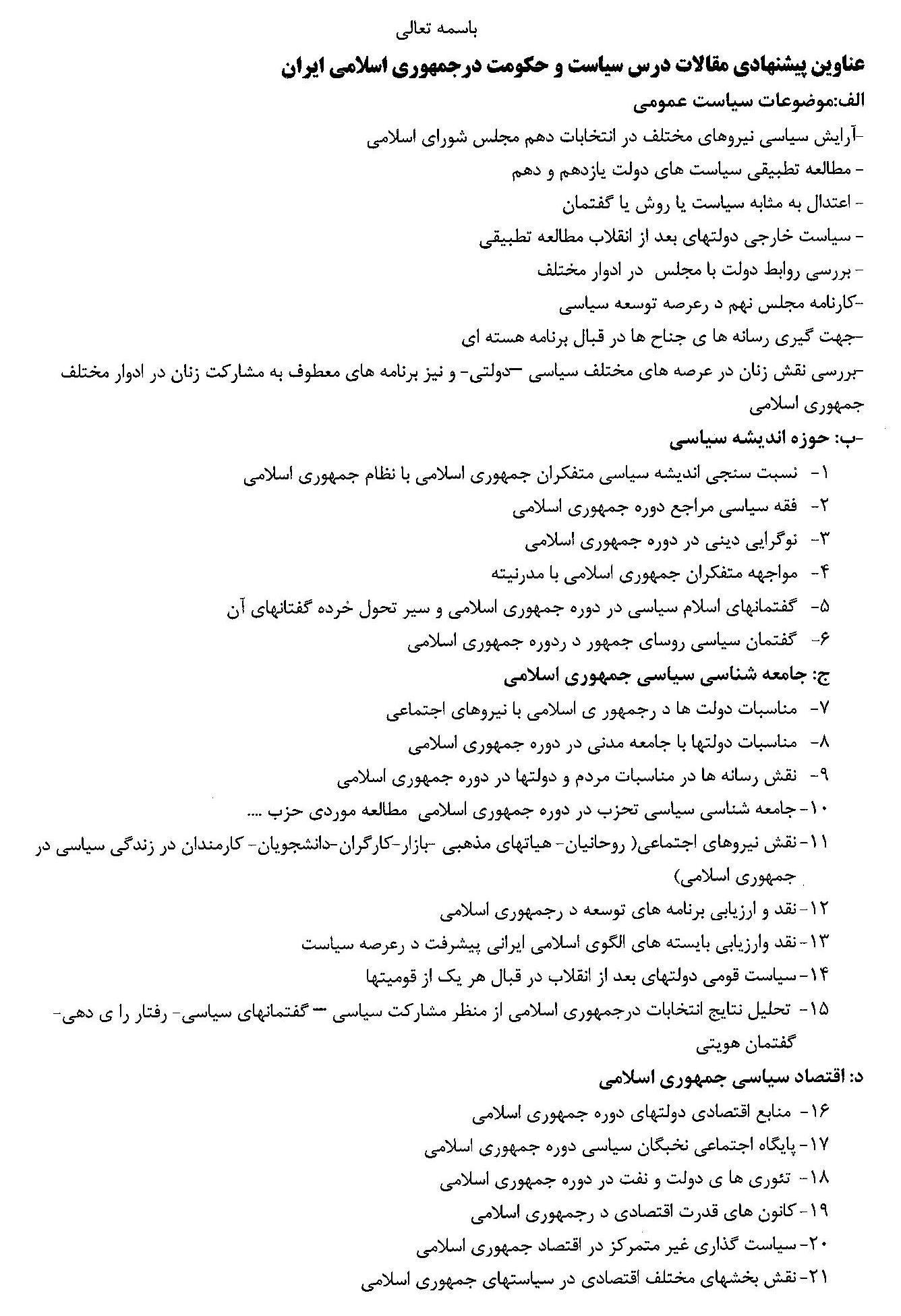 عناوین پیشنهادی مقاله برای درس سیاست و حکومت در جمهوری اسلامی ایران